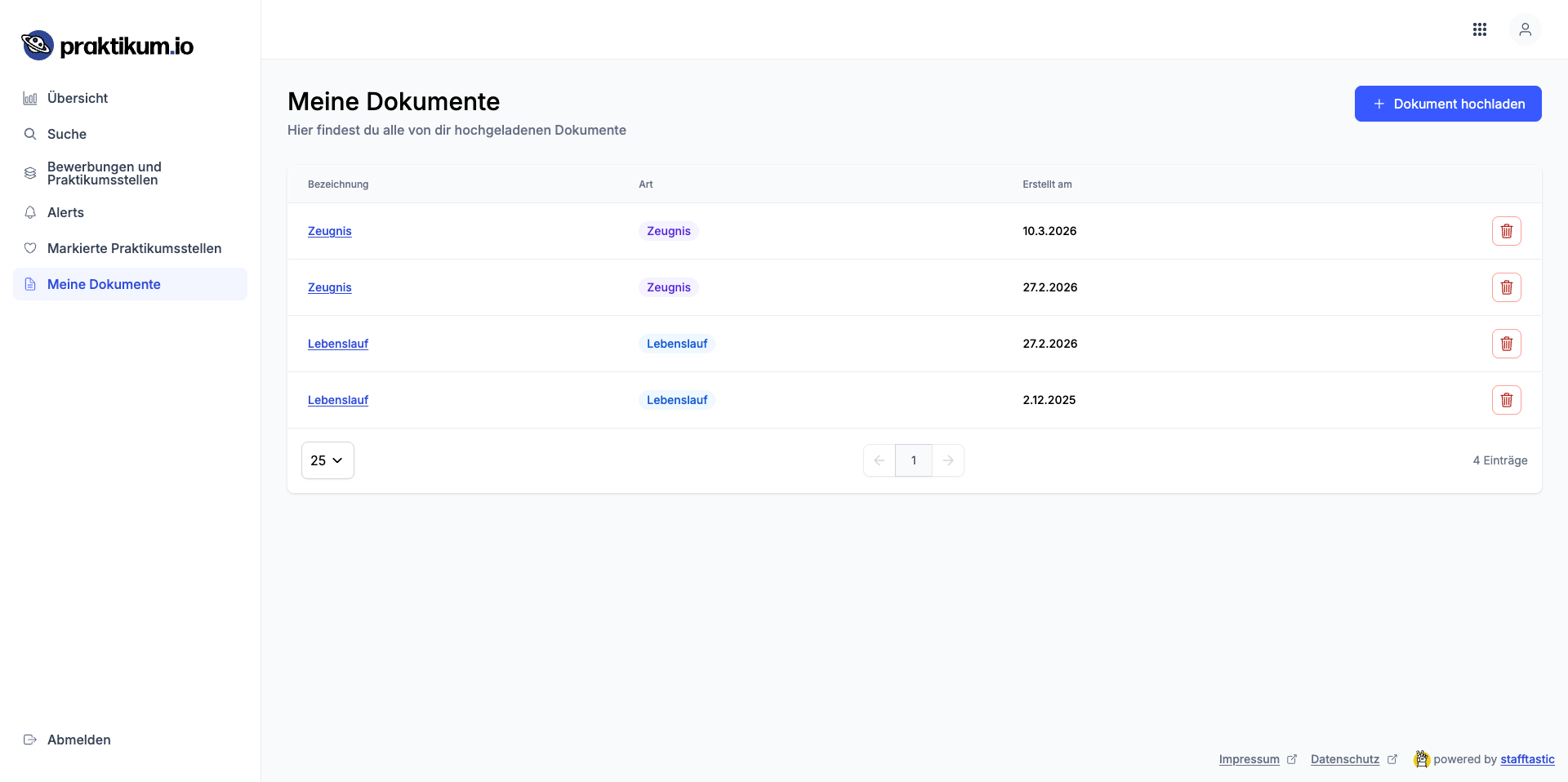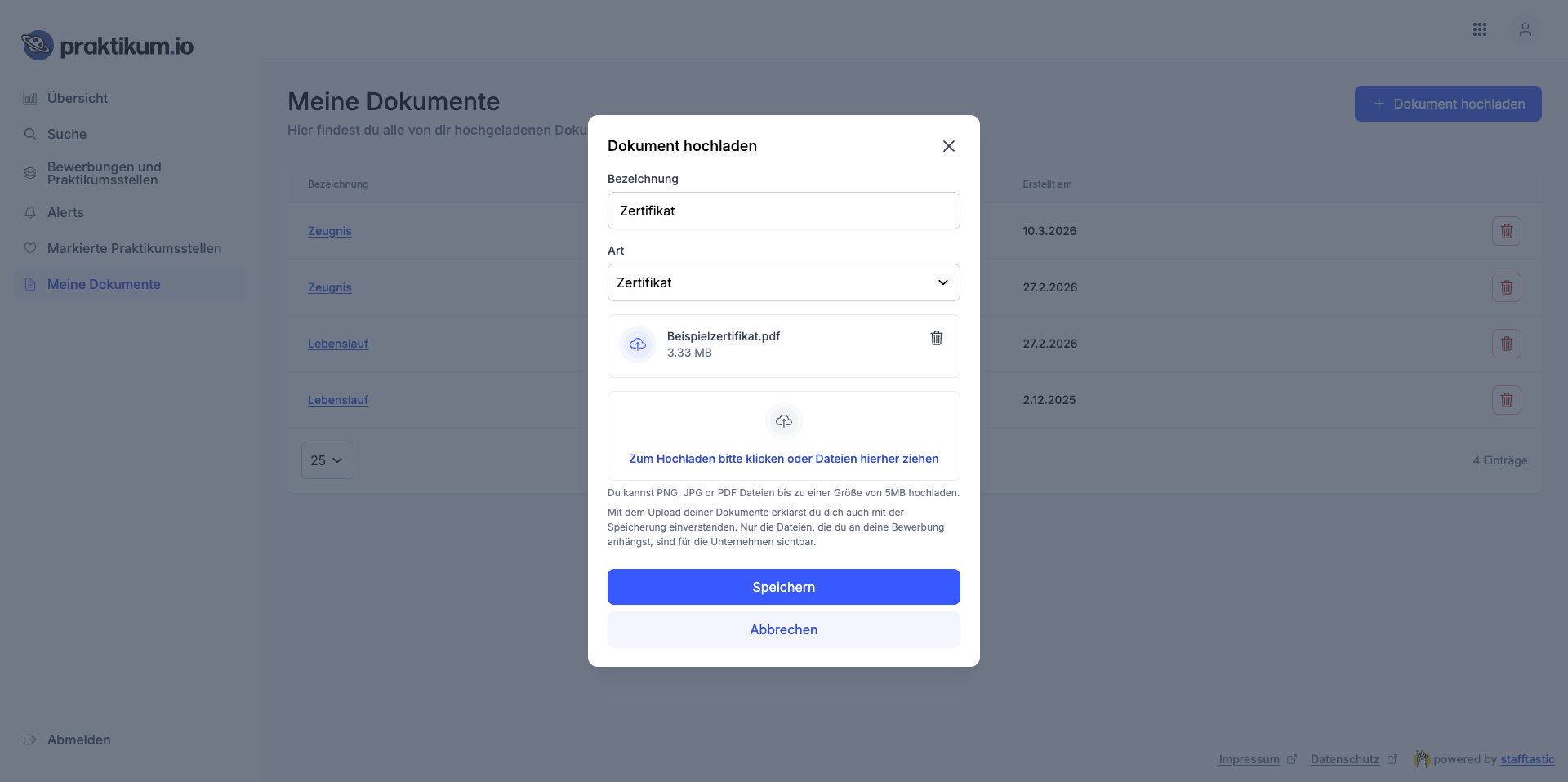 Hast du schon Dokumente, wie z.B. einen Lebenslauf erstellt, kannst du sie auch für deine praktikum.io-Bewerbungen nutzen. Auch Zeugnisse, Zertifikate oder Praktikumsbescheinigungen eignen sich, um sie an eine Bewerbung anzuhängen. Sie sind zwar kein Muss, aber manche Unternehmen möchten sie gerne bei einer Bewerbung haben.