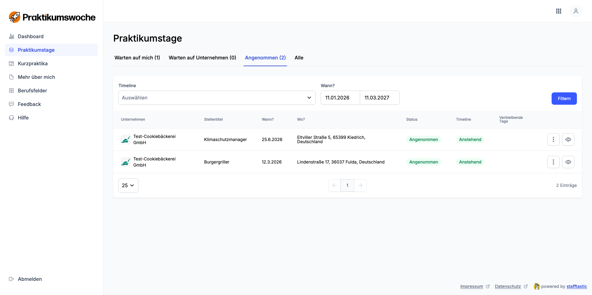 Alle feststehenden Praktikumstage werden dir unter "Praktikumstage" angezeigt.