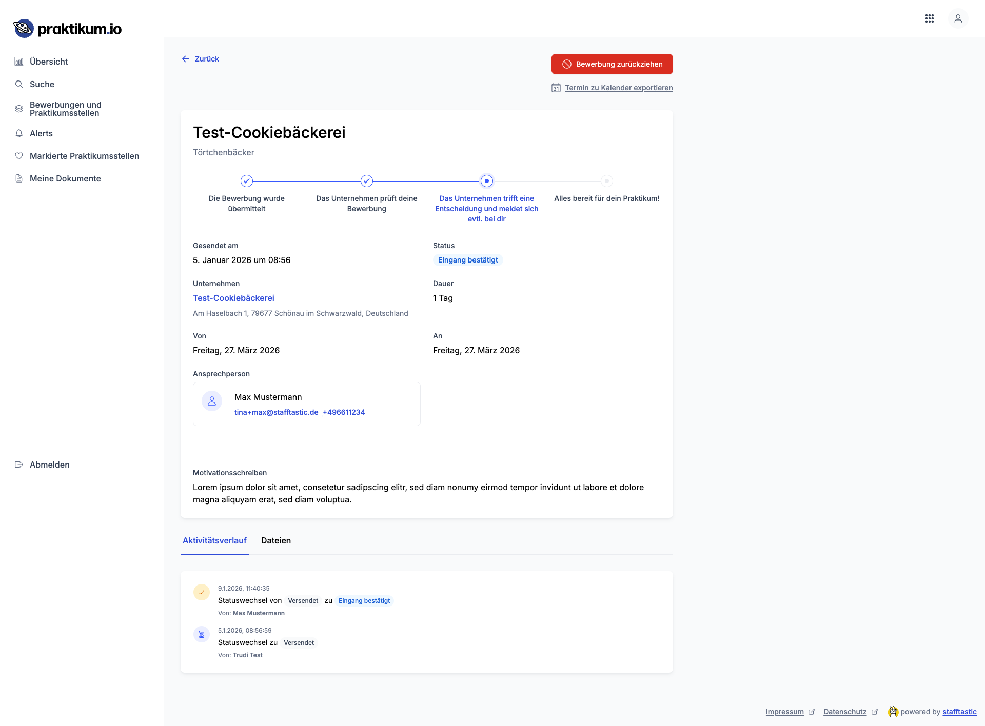 Deine Bewerbung durchläuft verschiedene Phasen, hast du sie abgeschickt, ist sie "Versendet". Wurde der "Eingang bestätigt", bedeutet das, dass eine der Ansprechpersonen die Bewerbung gesehen hat und sie nun prüft, sie wird dann entweder „Angenommen“ oder „Abgelehnt“. Manchmal kann es auch passieren, dass eine Bewerbung abläuft, das heißt, dass das Unternehmen nicht schnell genug reagiert hat.