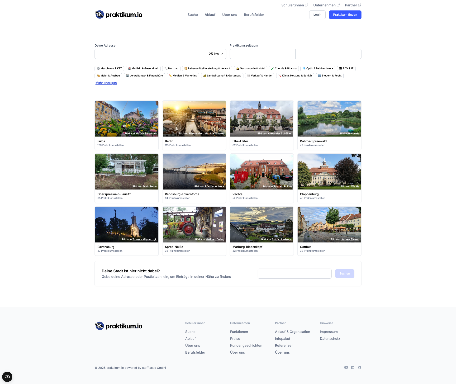Du hast auch die Möglichkeit, erst einmal zu schauen, wie das Angebot in deiner Region aussieht, bevor du dir ein Konto anlegst. Gehe dazu auf www.praktikum.io, gehe auf "Praktikum suchen", gib Adresse, Zeitraum und Berufsfelder ein und schon kannst du dir einen Überblick verschaffen. Ist das passende Praktikum für dich dabei, dann klicke auf "Bewerben", lege dir ein Konto an und schick deine Bewerbung los.
