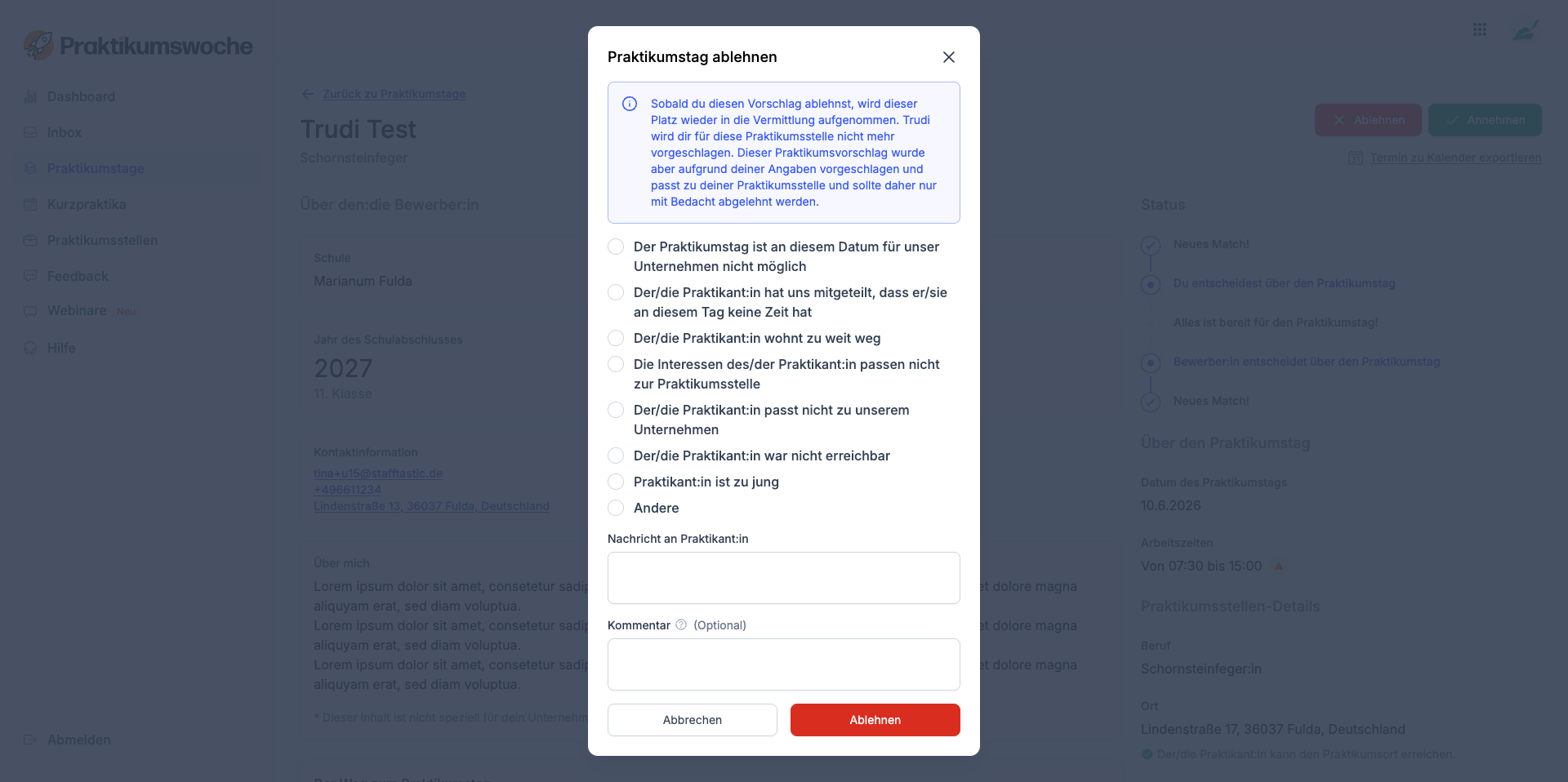 Wenn der:die Praktikant:in für einen Tag vorgeschlagen wird, an dem du ihn:sie doch nicht aufnehmen kannst, hast du die Möglichkeit, direkt Kontakt aufzunehmen und einen alternativen Termin zu vereinbaren. Mehr dazu erfährst du hier. Natürlich kannst du den Tag auch absagen.