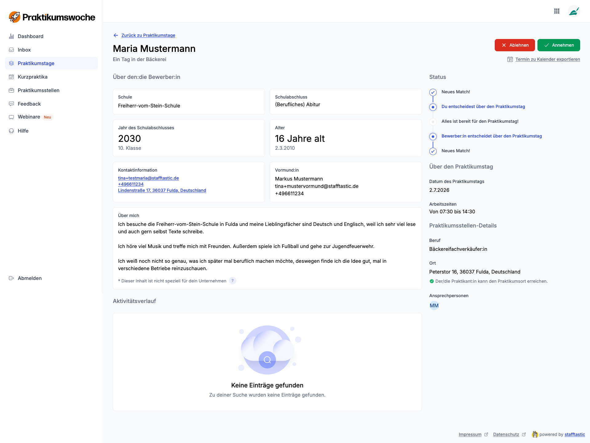 Anhand dieser Informationen kannst du entscheiden, ob du den:die Praktikant:in annehmen oder ablehnen möchtest. Bei gesondertem Klärungsbedarf kannst du ihn:sie über die angegebenen Kontaktmöglichkeiten auch direkt ansprechen.