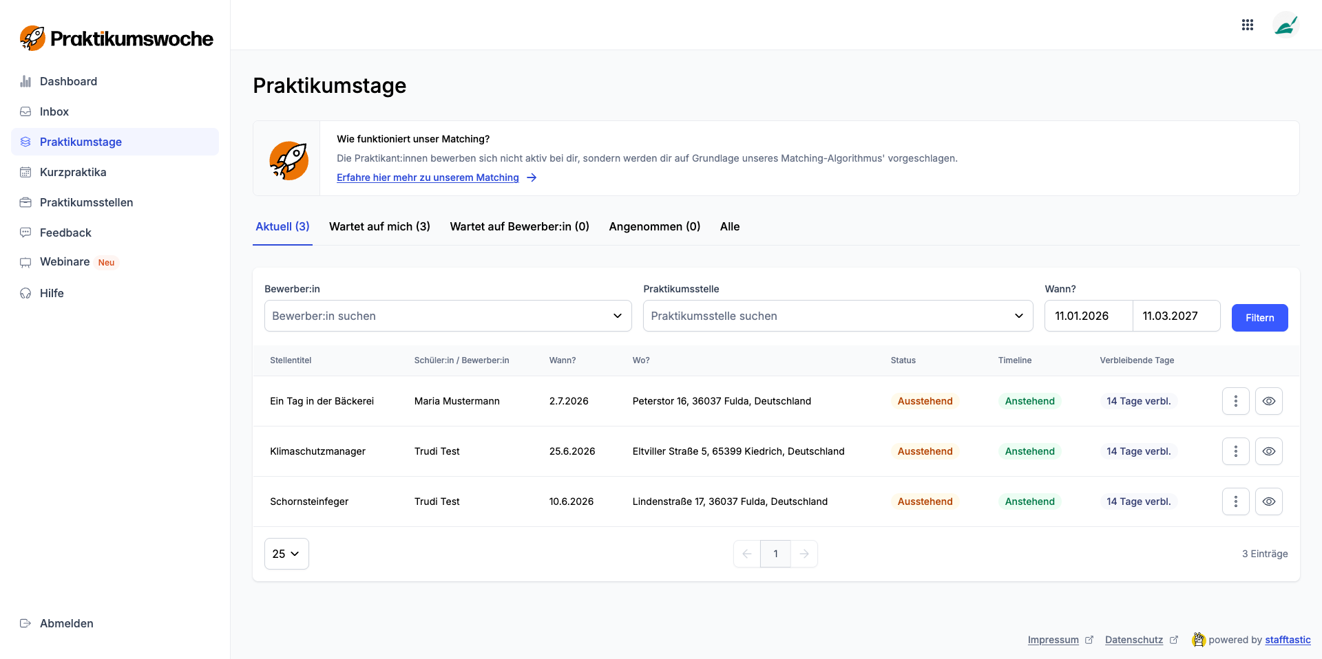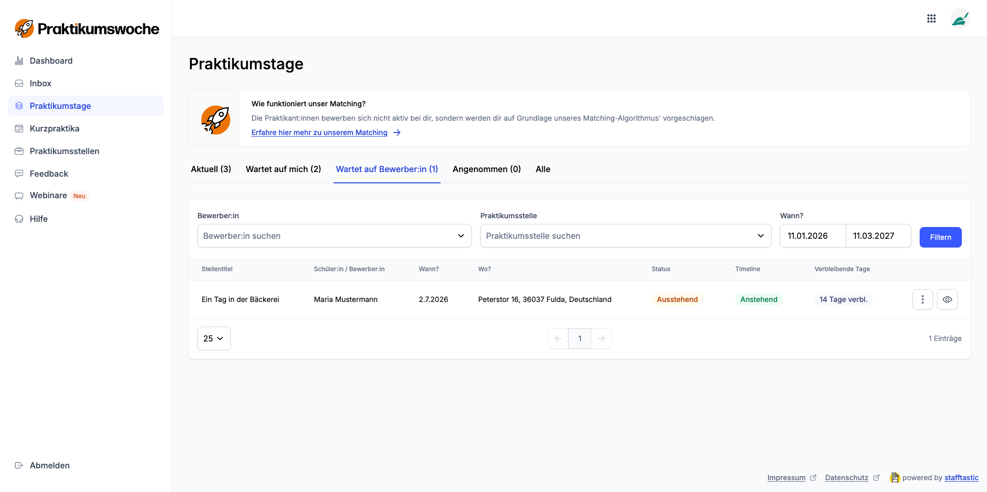 Wenn du ab sofort Vorschläge erhältst, dann solltest du wissen, dass der:die jeweilige Praktikant:in gleichzeitig benachrichtigt wird. Ihr entscheidet nun nämlich beide über den Praktikumstag. Die Schüler:innen werden auf diese Weise mehr einbezogen und du kannst dir sicher sein, dass sie sich mit dem Praktikumstag befasst haben. Demzufolge sieht nun auch die Übersicht der Praktikumstage etwas anders aus. Am wichtigsten ist für dich der Reiter "Wartet auf mich", denn das sind die Praktikumstage zu denen du noch eine Entscheidung treffen musst.