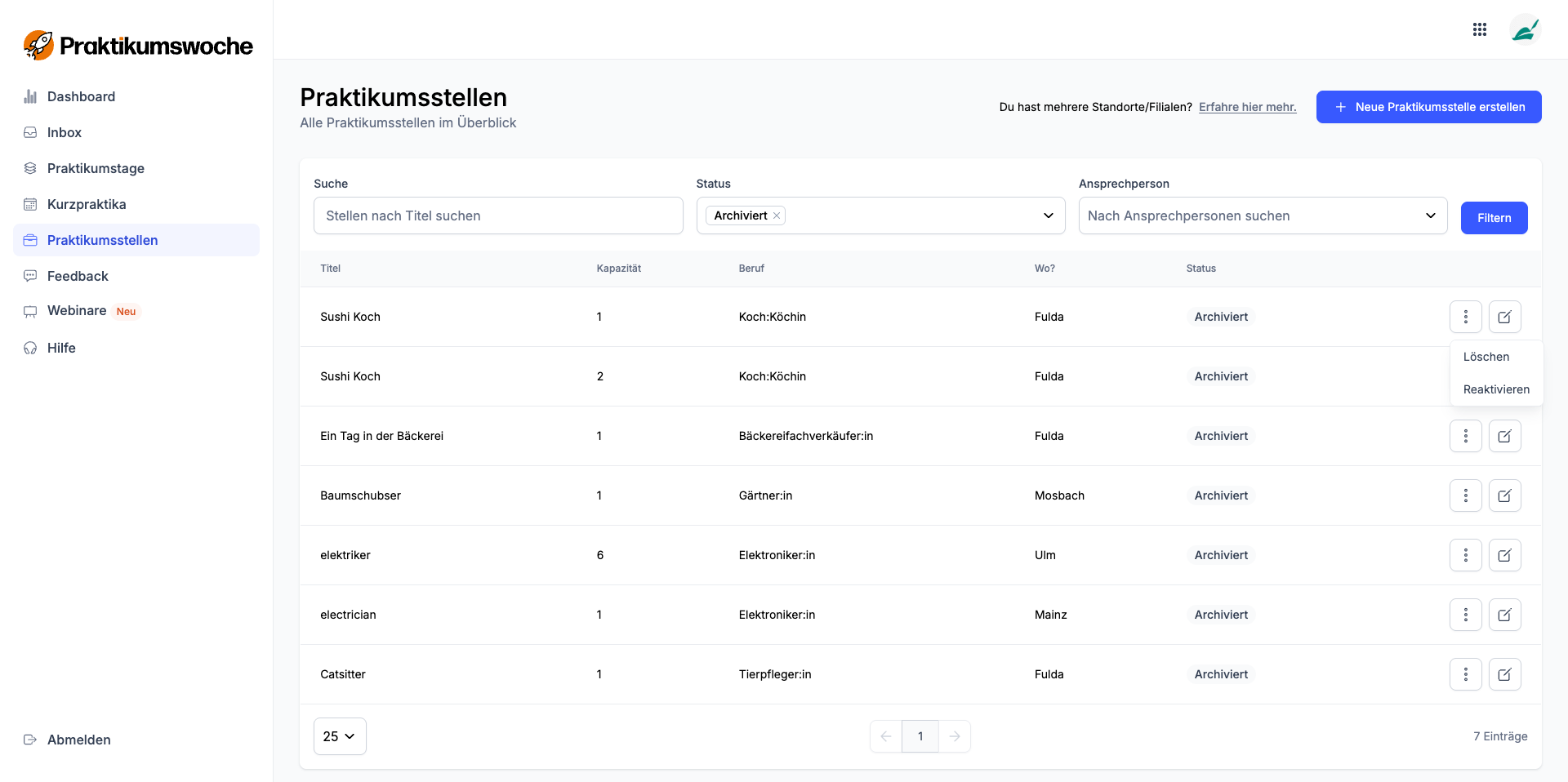 Wenn du eine Praktikumsstelle nicht mehr verwenden möchtest, hast du jederzeit die Möglichkeit sie auf "Entwurf" zu stellen. Du kannst sie aber auch komplett löschen. Dafür musst du sie zunächst archivieren. Da die Status-Filter "Veröffentlicht" und "Entwurf" standardmäßig eingestellt sind, musst du "Archiviert" hinzufügen und neu filtern, da du die Stelle sonst nicht sehen kannst.