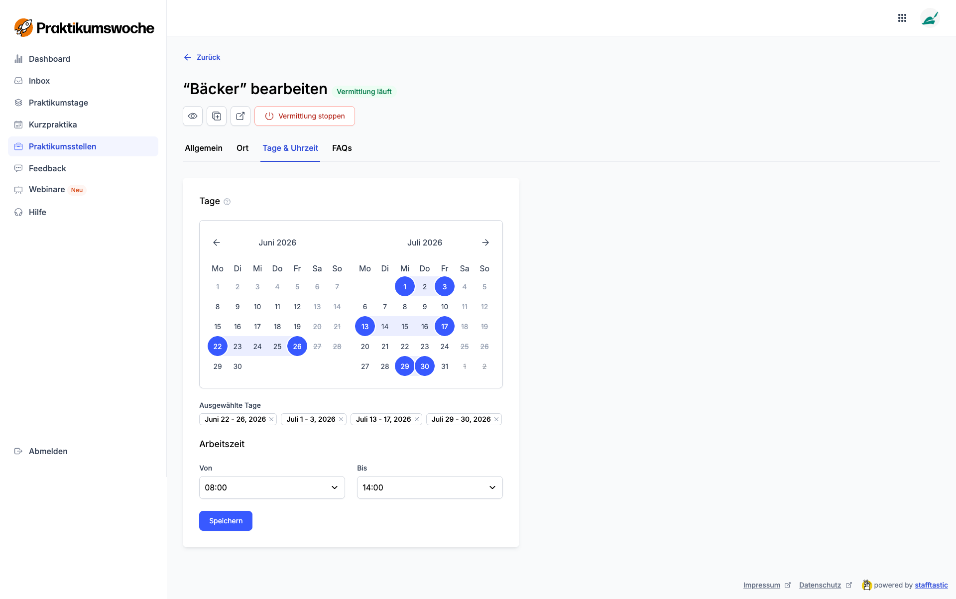 Wähle im Kalender die Tage aus, an denen du Praktikant:innen aufnehmen möchtest. Du kannst die kompletten Ferien oder auch nur einzelne Tage auswählen. Am Ende werden dir nur Vorschläge für diese ausgewählten Tage angezeigt.
