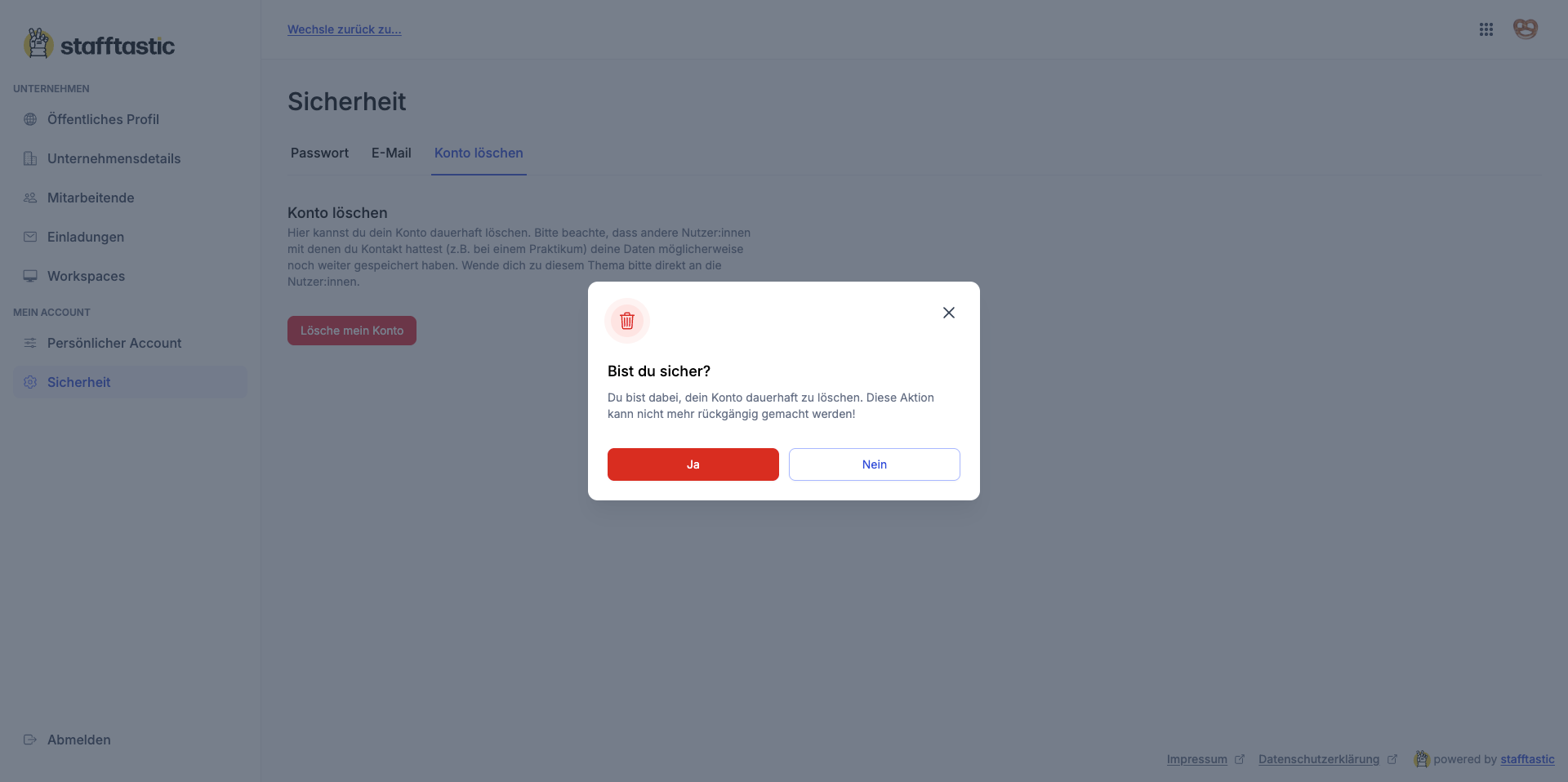Sind noch Kollegen in deinem Konto, werden sie automatisch Ansprechpersonen für die Praktikumsstellen. Bist du der letzte Mitarbeiter im Unternehmenskonto, dann wird es automatisch gelöscht. Sollten noch Praktikumstage oder Praktika anstehen, werden diese abgesagt.