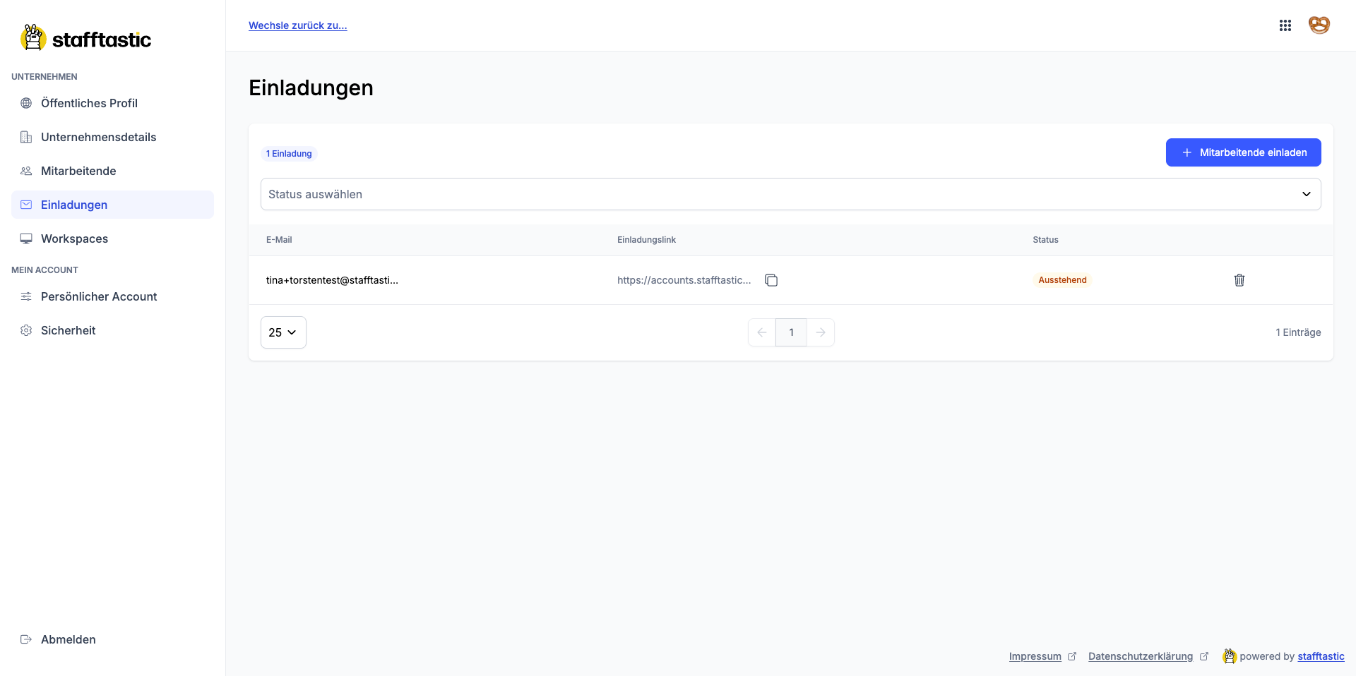 Klicke dort auf „Mitarbeitende“ oder "Einladungen" und dort auf „Mitarbeitende einladen“.