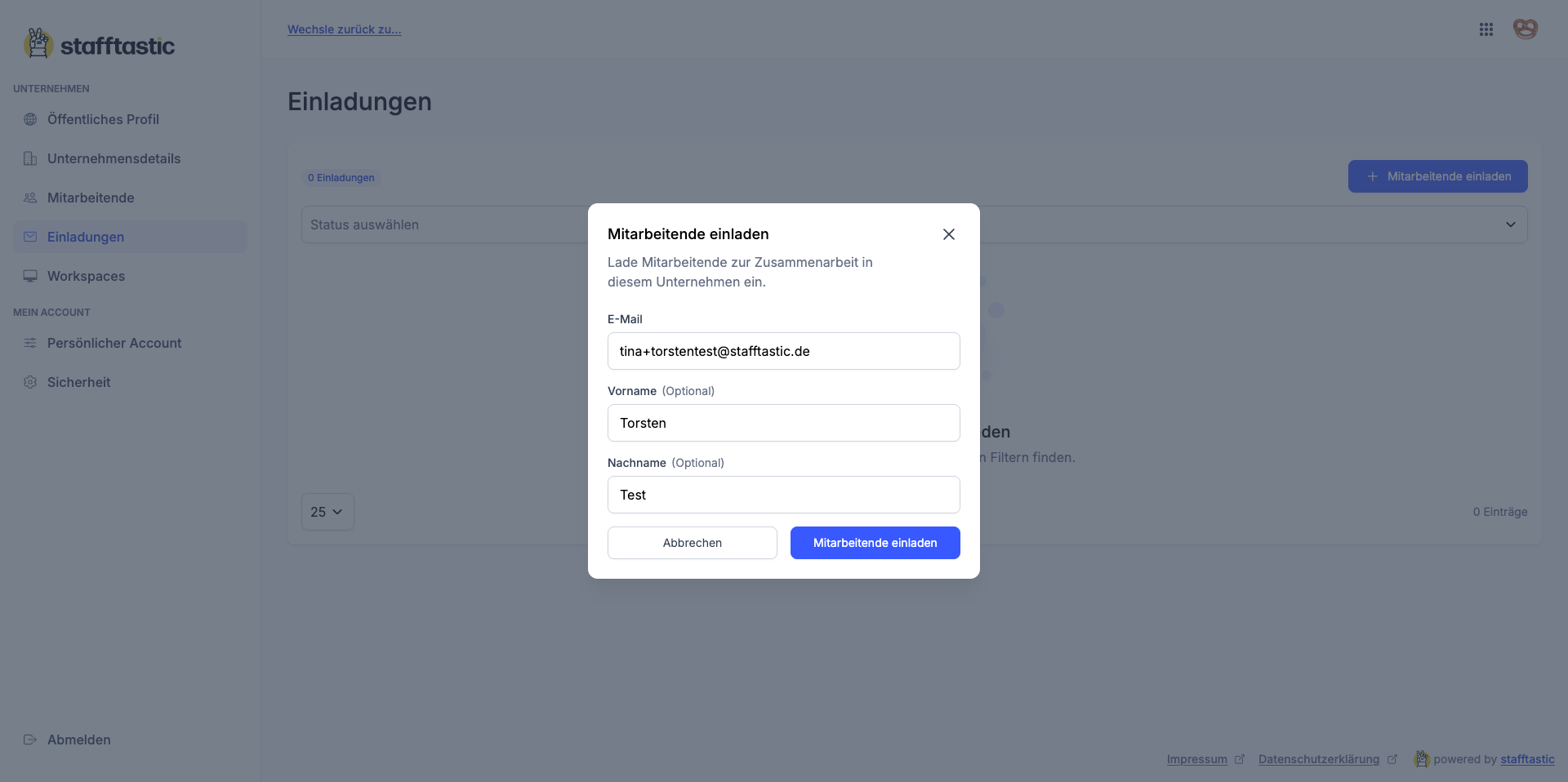 Hier kannst du nun die E-Mail-Adresse deiner Kolleg:innen angeben und sie können sich mit Hilfe des Einladungslinks in der E-Mail direkt anmelden.